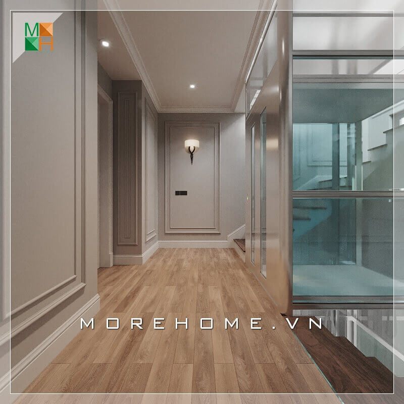 Lối thiết kế nội thất biệt thự, nhà phố. chung cư thông minh và tận dụng diện tích hành lang để thiết kế kệ tủ đồ gỗ cao cấp âm tường hiện đại và sang trọng có tính thẩm mỹ cao.